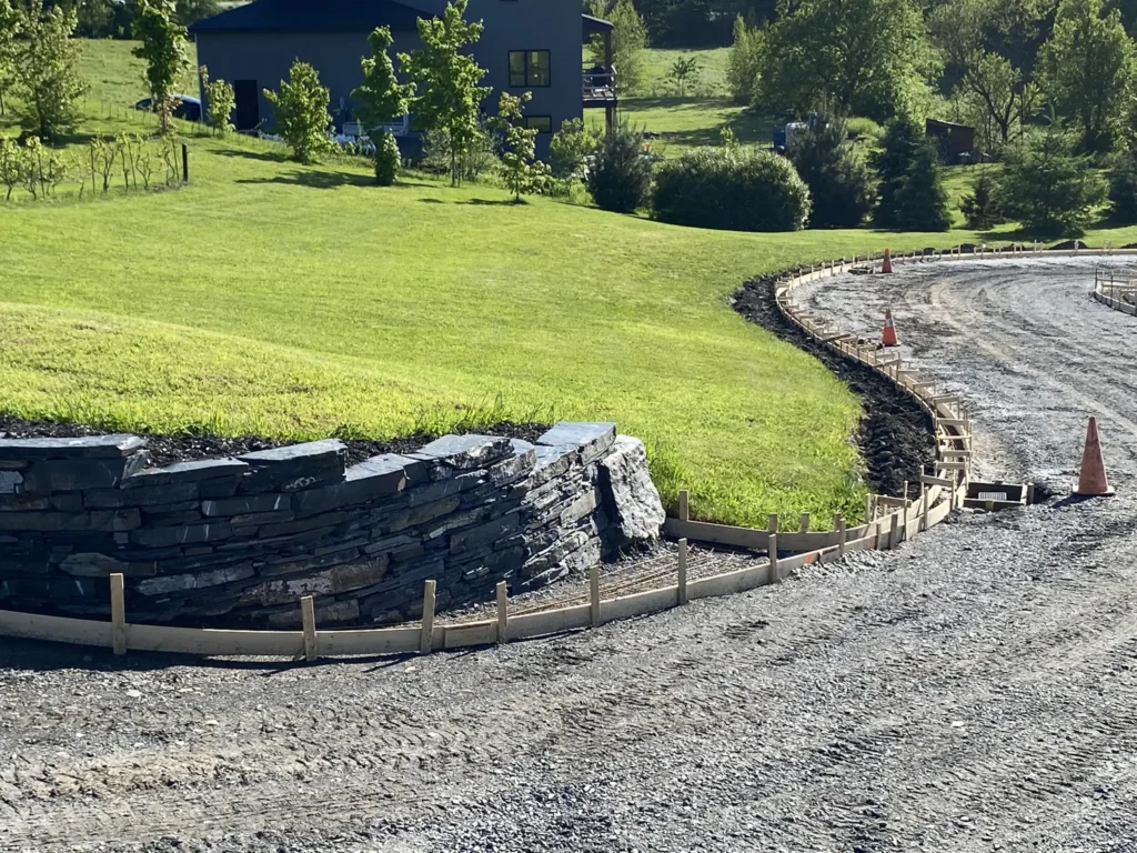- Muret et colonnes en ardoise naturelle, combinés à un mur en béton pour la fondation et l’infrastructure